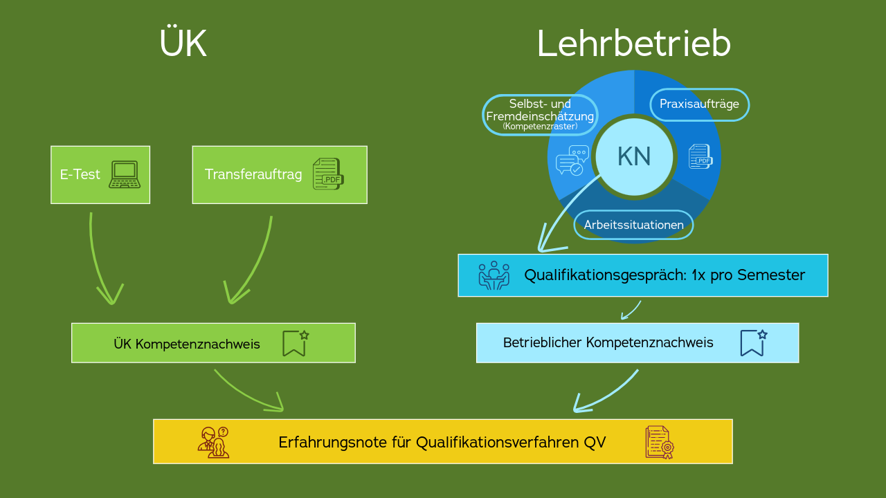 Die Lernenden erwerben während der Lehrzeit zwei überbetriebliche Kompetenznachweise. Jeder ÜK-Kompetenznachweis besteht aus zwei E-Tests und einem Transferauftrag. Die Punkte der E-Tests und des Transferauftrags werden zusammengezählt und ergeben eine Note (ÜK-Kompetenznachweis). Diese zählt zur Erfahrungsnote des Qualifikationsverfahrens.